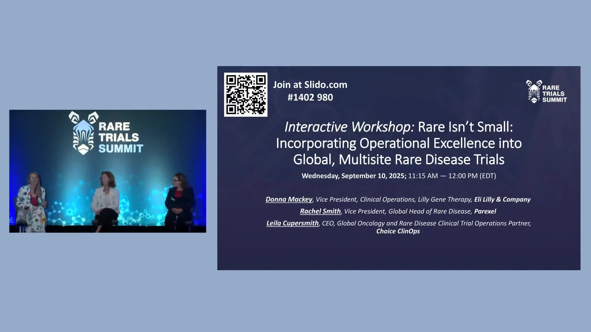 2025 Rare Trials Summit Skip to Videos All | Opening Keynotes | Trial Design | Patient Voice | Clinical Operations | Commercialization | Closing Panel | Opening Keynote: The Evolving Regulatory Environment for Rare Disease Trials Opening Keynote: The Future of Rare Disease Trials Accelerating Rare Disease Therapies: Strategies for Efficient Clinical Development Adaptive & Precision-Driven Trials: Platform and MATCH Models for Rare Disease Breakthroughs Solutions for Trial Design Challenges in Rare Disease Trials Optimizing Rare Disease Clinical Trials with Real World Data Using NLP & AI AI-Driven Patient Identification and Recruitment Operationalizing Precision Medicine in Rare Disease Trials Innovating Clinical Outcome Assessments in Rare Disease Trials: Integrating Patient-Centered Measures and Digital Health Technologies Reducing Patient Burden in Rare Disease Trials Ethics and Strategies for Returning Individual Patient Data Collected in Clinical Research Aligning Trials with Patient-Lived Experiences How to Accelerate the Adoption of Decentralized Trials for Rare Disease Indications Decentralized by Design: Operationalizing Hybrid Rare Disease Trials Beyond Biotech: The Rise of Nontraditional Sponsors in Rare Disease Trials Leveraging Patient Advocacy To Scale Rare Disease Trials How To Prevent Failure in Rare Disease Trials? Patient Recruitment and Engagement in in Global, Multisite Rare Disease Trials Rare Isn’t Small: Incorporating Operational Excellence into Global, Multisite Rare Disease Trials Optimizing CRO and Vendor Selection - Examples from the Field Beyond the Feasibility Survey: Strategic Site Selection to Accelerate Trials and Optimize Resources Purpose-Driven Metrics: Running Gene Therapy Trials with KPIs That Matter Designing Trials with the End in Mind: Building Market Access into Rare Disease Clinical Development What Matters to Payers: Conversations You Should Start During Phase 2 Real-World Evidence That Matters: A Hands-On Workshop in Building Credible Value Stories Conducting Rare Disease Clinical Trials to Support Market Access and Commercialization Patient-Centric Commercialization: Integrating Patient Voices into Market Access Strategies Case Studies in Rare Disease Commercialization: Lessons Learned Closing Panel: Beyond “One Disease At a Time”: Platform Approaches to Accelerate Gene Therapy Trials